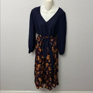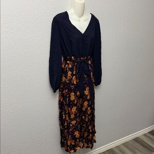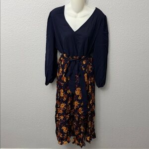 This elegant maxi dress features a solid navy v-neck bodice paired with a vibrant orange and yellow floral print skirt. The balloon sleeves and tied waist create a flattering silhouette for formal or casuall. No visible stains, holes, or defects. Perfect for spring weddings, garden parties, or brunch.