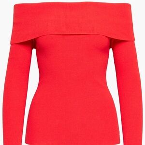 The Wilfred Nola Sweater by Aritzia in a bold, vibrant red. This is an off-the-shoulder knit sweater with a slim, flattering fit and a wide fold-over neckline that sits beautifully across the shoulders. Made from Wilfred’s soft Wonder Yarn for a lightweight, all-season feel with stretch.