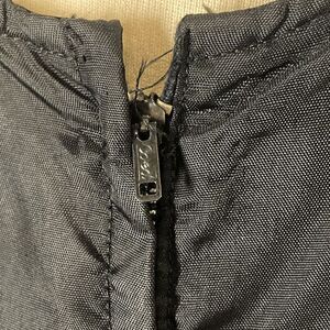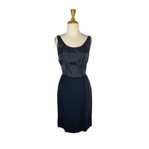 Fitted black sleeveless scoop neck dress with satin top and pencil skirt with coordinated jacket featuring princess seams, satin shawl collar and a large satin bow with fringed edges. Metal Zippers.