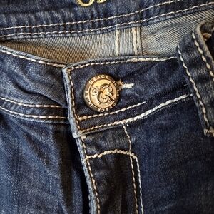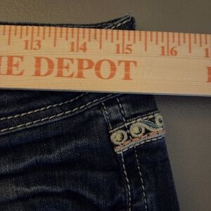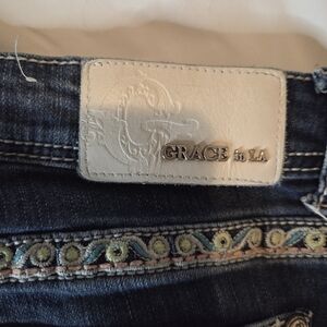 Grace In LA Dark Blue Distressed Boot Cut Jeans Embellished Pockets Size 31