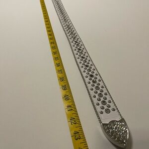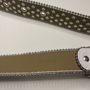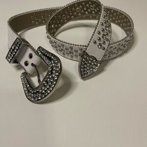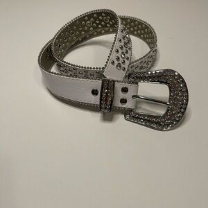Elevate your style with this elegant white studded belt, featuring striking silver accents. The belt will fit a waist size 32 - 34 in men’s. One rhinestone is missing and can be seen in the photo with the pencil (which is pointed to the missing rhinestone. Total length of the belt with buckle is 44inches. Perfect for adding a touch of sophistication to any outfit.