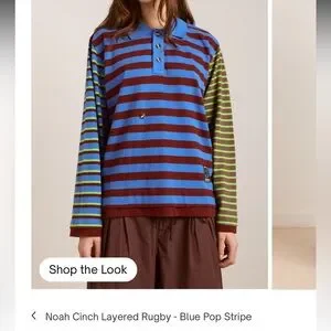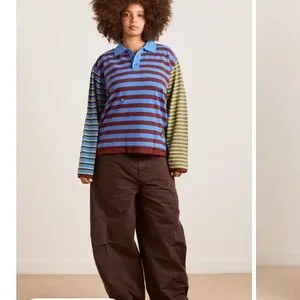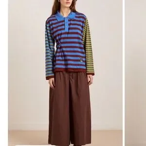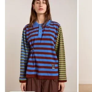Colorful striped long sleeve polo shirt with button details. Features blue, brown, and green stripes.
