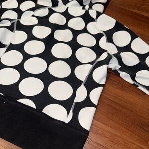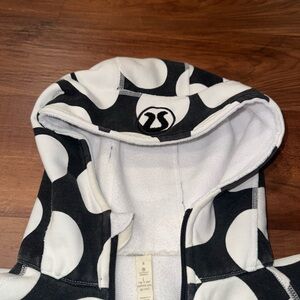 Lululemon full zip Scuba hoodie in a bold black and white polka dot print. Features thick fleece fabric, curved seam detailing, ribbed cuffs/hem, and a cozy structured hood. Classic athletic streetwear piece perfect for layering or everyday wear.