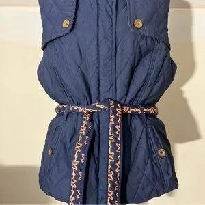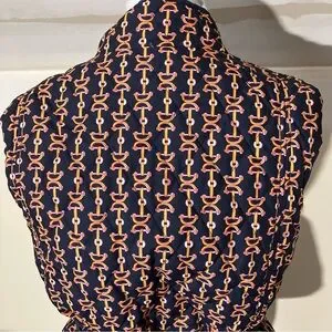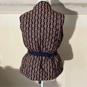 - It is a navy blue quilted vest that is reversible, featuring a horse bridle bit print design on the reverse side and a matching removable tie belt