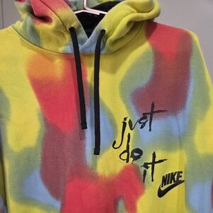 Vibrant tie-dye hoodie with 'Just Do It' logo. Features a mix of red, yellow, and blue colors.