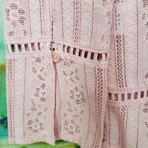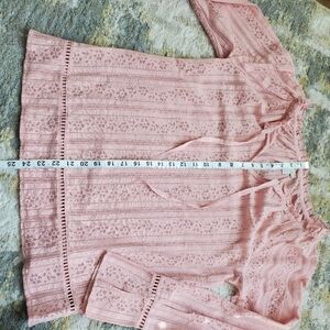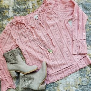 Delightfully feminine & beautiful Hinge brand lace like long sleeve top. This subtle POP of color will bring sunshine to everyday you wear it! Pairs beautifully with jeans & flats or heels! Excellent Pre-Loved Condition.
