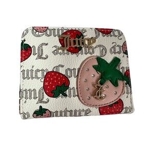 Keywords: Juicy Couture wallet, strawberry print wallet, zip around wallet, small wallet, faux leather wallet, logo hardware, rhinestone charm, JC charm, card slots, ID window, floral wallet, white pink gold, women’s accessories, compact wallet, designer wallet
