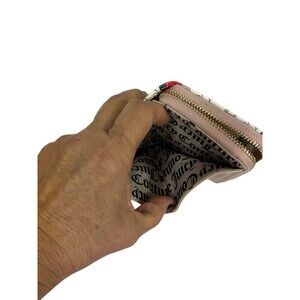 Juicy Couture women’s small zip-around wallet in multicolor faux leather with allover logo and strawberry floral print. Gold-tone logo hardware with rhinestone accents, strawberry applique, and dangling JC charm. Interior card slots and an ID window. Measures 4 1/2” x 3 3/4”. Suitable for everyday use, travel, or gifting. New with tags.
