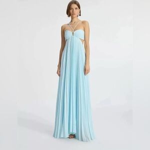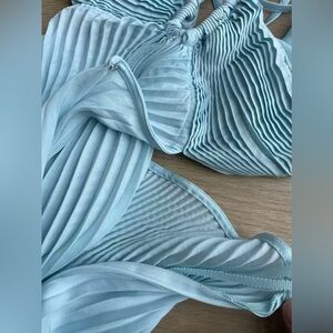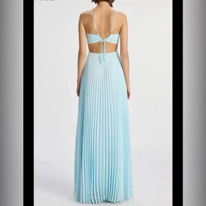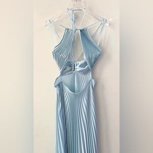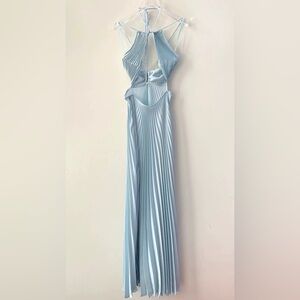 This elegant light blue maxi dress features a stunning pleated design and a chic back tie detail. Perfect for any special occasion, it offers both style and comfort.