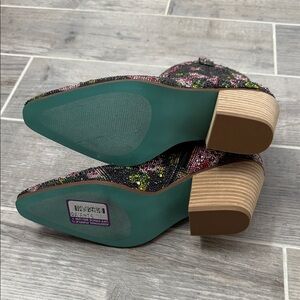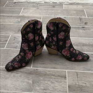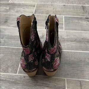 Stylish black ankle boots with vibrant floral design. Perfect for adding flair to any outfit.
