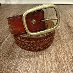 Vintage Leather Belt Hand Tooled Solid Brass Buckle Floral Western Boho Wide M\L
