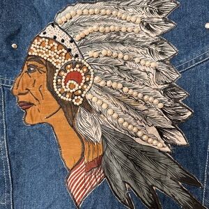 Vintage Unique denim jacket featuring an embroidered Native American chief design. Accented with intricate beadwork and patterns. Definitely has a western look and very striking! Some pearls need reattached to be more secure. In great condition for its age! All measurements in photos.
