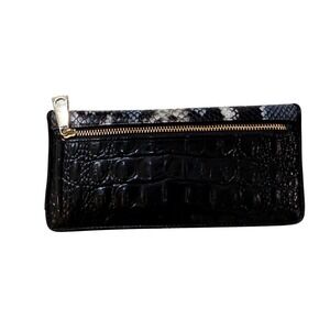 Elevate your everyday with this stunning Brahmin wallet clutch, a masterpiece of luxurious design and practical elegance. The rich black crocodile embossed leather meets a striking snake-skin accent, creating a sophisticated visual and tactile experience. Open the gleaming gold zipper to reveal a thoughtfully organized interior, complete with multiple card slots, a clear ID window, and ample space for your essentials. This chic accessory is perfect for transitioning from a busy workday to an elegant evening out or a stylish weekend brunch.