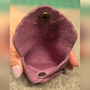 by Portland Leather. Credit card size tiny leather wallet with a soft textured finish and nice suede interior. Features a metal button closure.