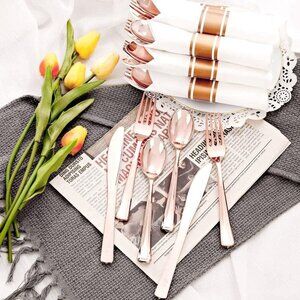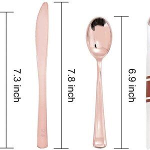 Value Pack: the rose gold cutlery include 60 forks, 60 knives, 60 spoons 60 Napkins. Rose gold plastic silverware are suit for any occasion, also make a great gift for people who like enjoyable entertaining and casual everyday elegance.