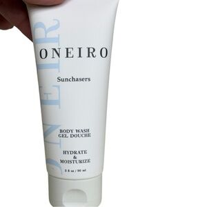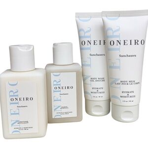 Luxury travel-sized Oneiro Sunchasers set includes shampoo, conditioner, body wash, and body milk. Hydrating and moisturizing formula, perfect for beach trips or everyday pampering.