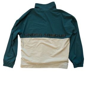 Lightweight Under Armour zip-up windbreaker in a teal and light green colorblock design. Features a high collar, elastic cuffs, mesh lining for breathability, and front pockets. Sporty and loose fit, great for workouts, walks, or casual athleisure wear. Great condition.
