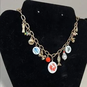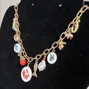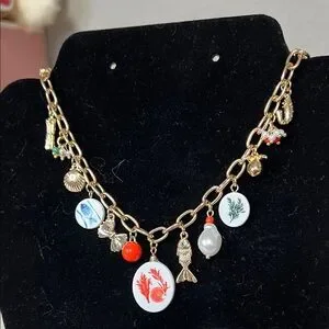 This exquisite gold necklace features delightful charms in red, green, and silver. A perfect accessory to elevate your style with a touch of elegance.