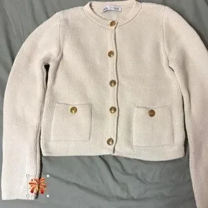 Stylish cream cardigan featuring gold buttons. Perfect for layering.