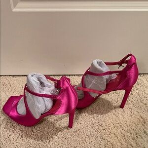 Vibrant Hot Pink Fuchsia Satin heels with elegant straps. Perfect for adding a pop of color. Square Open Toe.