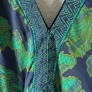 Stunning cotton balloon sleeve tiered midi dress in the navy tulip print. V Neck with embroidered details.