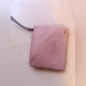 Elegant pink wristlet with embossed AK design. Perfect for any occasion. Compact and stylish.