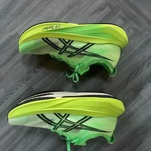 Dynamic ASICS Megablast shoes in vital green and black. Ideal for running.