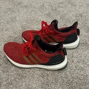 GOT themed red Adidas Ultra Boosts. Ideal for running and everyday wear. Like new condition with very little wear.