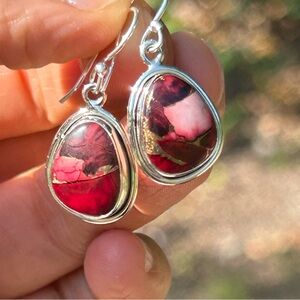 These exquisite earrings showcase deep red stones elegantly set in a polished silver frame, offering a timeless and sophisticated look. The translucent quality of the stones captures light beautifully, making them a standout accessory for any occasion. Beautiful unique, genuine turquoise.