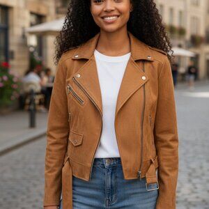 Stylish and versatile Forever 21 women’s moto jacket in a beautiful warm brown tone. This jacket features a classic biker-inspired design with an asymmetrical zip front, silver-tone hardware, zippered pockets, and a matching belt detail at the waist for a flattering fit.
