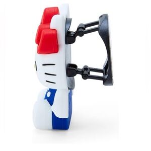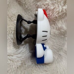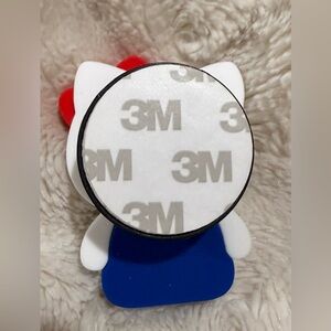Cute Hello Kitty phone holder. Features red bow and blue outfit. Perfect for fans.