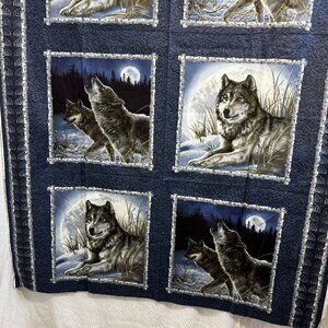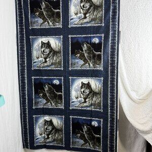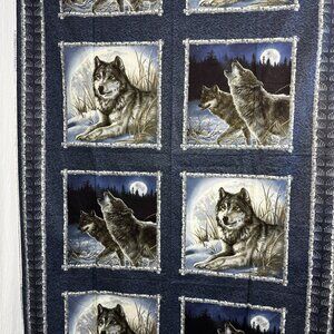 • Quilted fabric panel with wolf and moonlit forest scenes