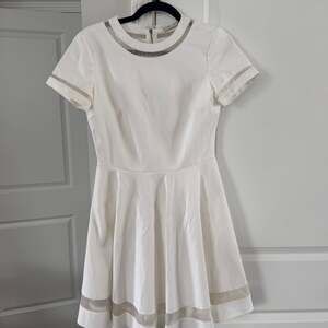 Turn heads in this Alice + Olivia white fit-and-flare mini dress featuring delicate mesh accents on the collar, sleeves, and hem. Crafted with a flattering fit-and-flare silhouette and short sleeves, this dress combines feminine elegance with modern details for a look that’s perfect for cocktail parties, date nights, or special occasions.