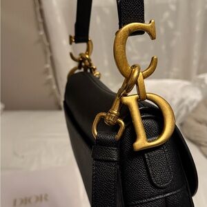 Chic Dior saddle bag in black. Features elegant gold accents. + additional Cristian Dior strap. Perfect for elevating any look.