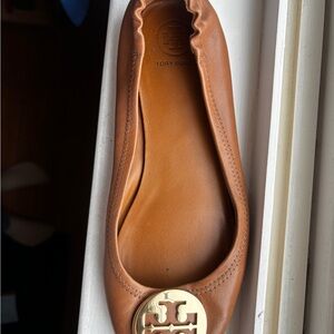 Elegant tan leather flats by Tory Burch. Features iconic gold logo detail. Ideal for versatile styling.