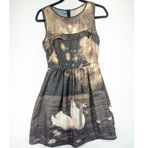 Keywords: Eva Franco dress, swan print, water lily, galaxy print, star print, sleeveless dress, ruffle detail, flared skirt, whimsical, ethereal, fairy tale, unique print, summer dress, party dress