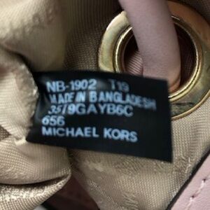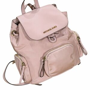 Michael Kors Abbey Cargo Backpack, style 35T9GAYB6C, in Blossom pink. Crafted from durable nylon with gold-tone hardware. Features a flap-over top with magnetic snap and drawstring closure. Includes a front zip pocket, two side zip pockets, and interior slip and zip pockets. Adjustable shoulder straps.
