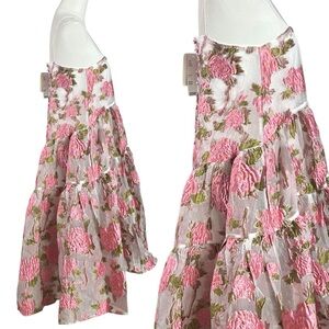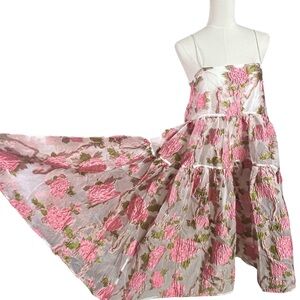 Floral organza jacquard fabric midi dress with a tiered skirt. Loose fit featuring a high low hem.