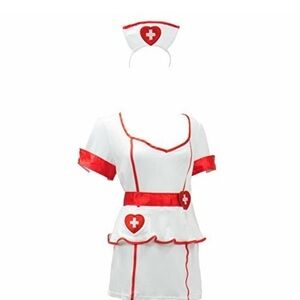 Stylish nurse costume in white and red. Features a fitted dress with matching hat and stockings.