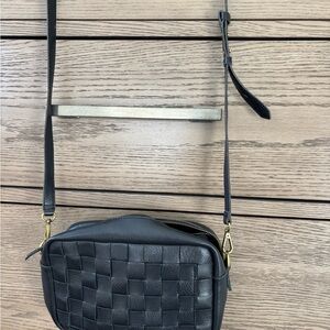 Elegant black leather crossbody bag with a stylish woven design. Perfect for any occasion.