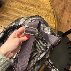 Chic quilted tote with a camouflage pattern. Features shades of gray and brown. Perfect for a carry - even has a slot to hook into suitcase.