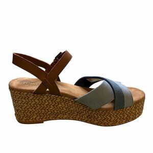 Toms Sandals Size 9.5 Willow Platform Wedge Blue Denim Tan Leather Espadrille