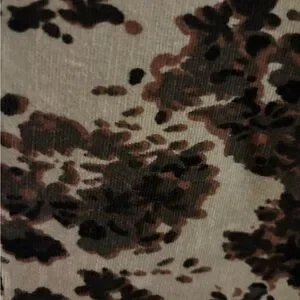Soft stretch corduroy featuring an allover camo-inspired floral print in olive, green, and brown tones.