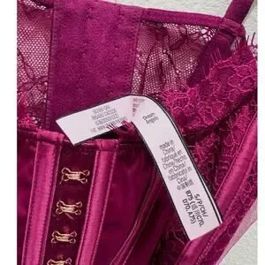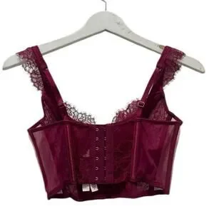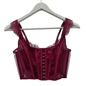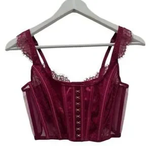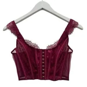 Stunning Victoria’s Secret Dream Angels lace corset bustier in a rich burgundy wine shade. Features structured satin boning for a snatched waist look, sheer mesh side panels, delicate lace trim straps, and a hook-and-eye front closure.
