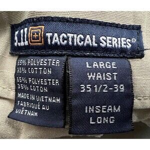 These 5.11 Tactical Series beige pants are a great addition to any wardrobe. They are designed for men, with a size XL and waist size of 35 inches, and have a straight leg style with a 33-inch inseam. The pants feature an elastic waist, snap and zipper closures, and a front flat design. The cargo pockets with internal compartments and double reinforced seat provide ample storage space and durability. The pants are made of a blend of polyester and cotton with a ripstop design for added toughness. They are machine washable and perfect for casual or workwear occasions. These pants are part of the 511 Tactical product line and are ideal for those who enjoy tactical duty, outdoor activities, and high-performance apparel.