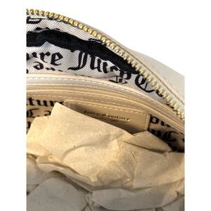 The bag's interior is lined with a mix of leather and fabric, and it comes with a pouch and wristlet accessory. The bag is made of faux leather and velvet, giving it a luxurious feel. The bag is adorned with the iconic Juicy Couture logo, featuring heart, dusty, and angel characters. This satchel is a must-have for any fashion-forward woman.