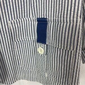 Totally 80's in a shorter length, stretch seersucker and a cute contrasting grosgrain ribbon pocket & back detail. Blue & White pinstripe. For all your retro vibes!
