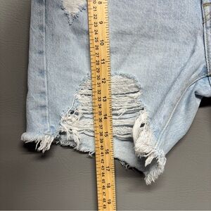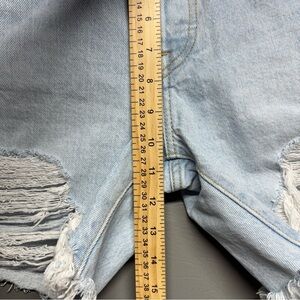 Classic Levi’s 501 Original denim shorts in a light wash. High-rise fit with a straight leg and raw hem. Features distressed details on front and back, 5-pocket styling, button fly, and iconic Levi’s leather patch,100% cotton,Timeless, style perfect for summer,Good pre-owned condition, intentional distressing.