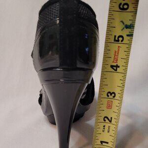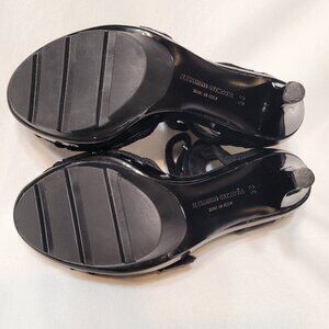 The Alessandro Dell'Acqua women's black stiletto platform heels are a stylish and sophisticated choice for any party or cocktail occasion. Made in Italy with leather upper material and adjustable ankle and toe straps, these strappy sandals showcase a mesh accent and ultra-high platform stiletto heel. The black patent leather design exudes a fashionista vibe, perfect for a summer, fall, or spring outfit. With a hook and loop closure, these platform heels in size 5.5 (UK 3.5, EU 36) are a must-have for any going out or celebrity-inspired look. No box