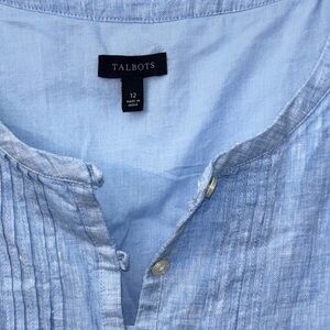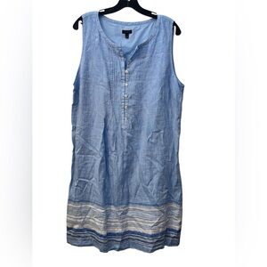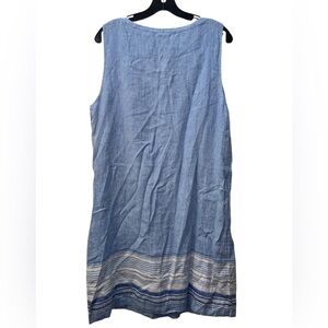 Stylish light blue dress featuring a striped hem. Perfect for casual wear.